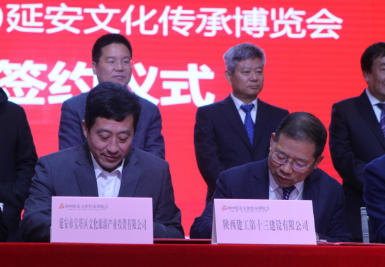陜西建工第十三建設(shè)有限公司董事長(zhǎng)(右)與延安市寶塔區(qū)文化旅游產(chǎn)業(yè)投資有限公司董事長(zhǎng)米強(qiáng)(左)代表雙方簽約。