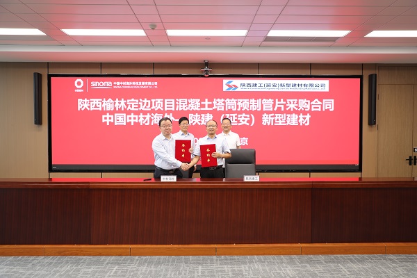會上,中國中材海外科技發(fā)展有限公司黨委副書記、總經(jīng)理祝林和,集團總工程師、新型建材公司董事長王弘起代表雙方簽訂了陜西榆林定邊項目混凝土塔筒預(yù)制管片采購合同。